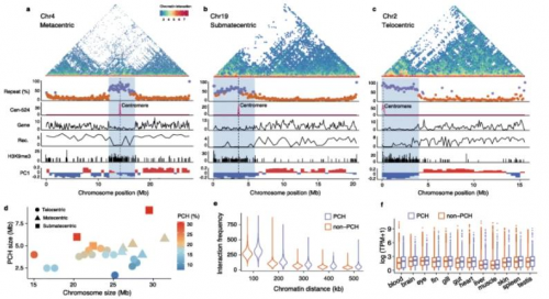 为了确定着丝粒周围区域的边界,研究团队检测了染色体重复丰度。着丝粒周围区域(~4 Mb)具有较高的重复序列、较低的基因密度、较低的重组率和更频繁的H3k9me3修饰,与PCH一致。大多数PCH长约4.2 Mb,其大小仅与染色体大小呈弱相关且不显著。较小的染色体,特别是端着丝粒和近中着丝粒染色体,具有较大比例的PCH,包括XY染色体。在着丝粒周围区域,较大物理距离上的染色质相互作用更为频繁,与其较高的折叠和压缩程度特征一致。着丝粒周围区域比其他区域有更大比例的高表达水平和宽度的基因,与前人研究观点一致,即H3K9me3在基因抑制中的作用有限,可能存在其他表观遗传修饰调节PCH中的基因表达(图4)。