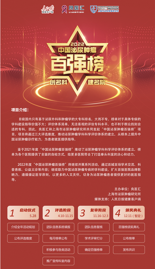活动将从临床技术与医疗质量、学术影响力、社会影响力及专科声誉四大维度,遴选全国排名前100强的泌尿肿瘤团队,并于2022年年底公布最终评选结果。