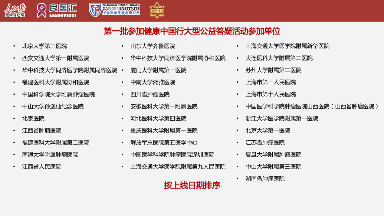 4月以来,组委会联合百强医院共同举办了“中国泌尿肿瘤百强医院健康中国行大型线上公益答疑活动”,切实推动中国泌尿肿瘤的学科建设,让众多中国泌尿肿瘤患者获益,组委会也向这30多家参与的医院和单位表示感谢。