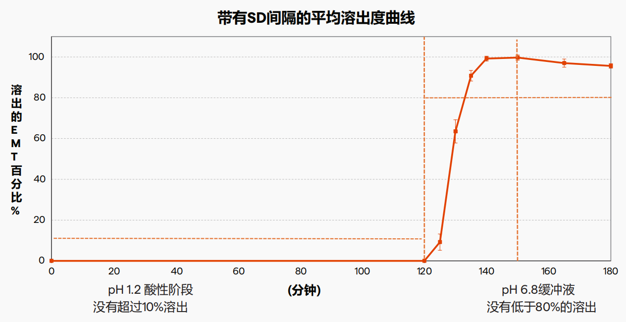 使用 HPMC 和 HPMC-AS 材质,耐酸性强,无需绷带或微喷封口情况下,可耐受 pH 6.0 以下酸性环境 ,又可在缓冲液(pH6.8)中快速崩解释放(30 分钟内),能够有效保护酸敏感的 API,防止胃部刺激并增加肠道吸收[4]。